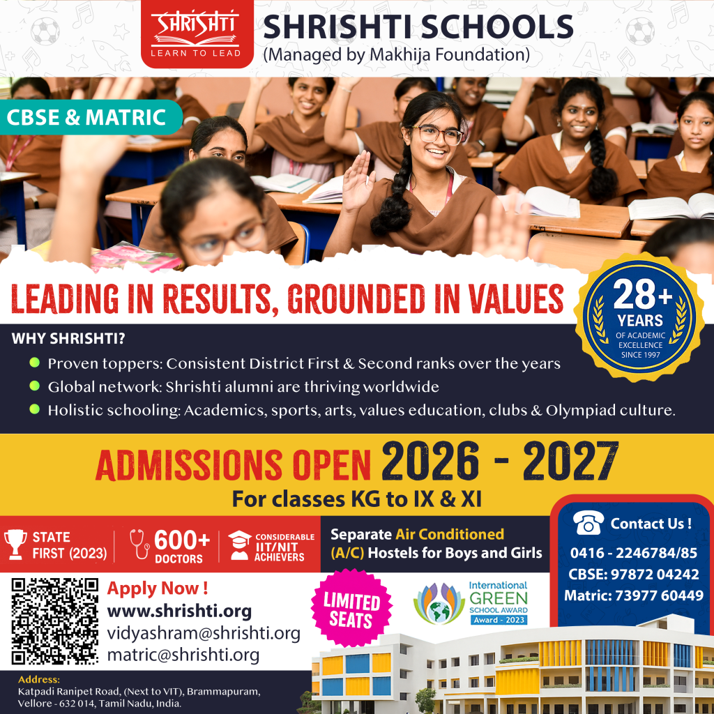 Shrishti Vidyashram is a CBSE Senior Secondary School in Vellore located on the sprawling Shrishti Campus, Vellore. Since its inception in June 2002 Shrishti CBSE has become one of the most preferred Schools for high quality education in Vellore District.
